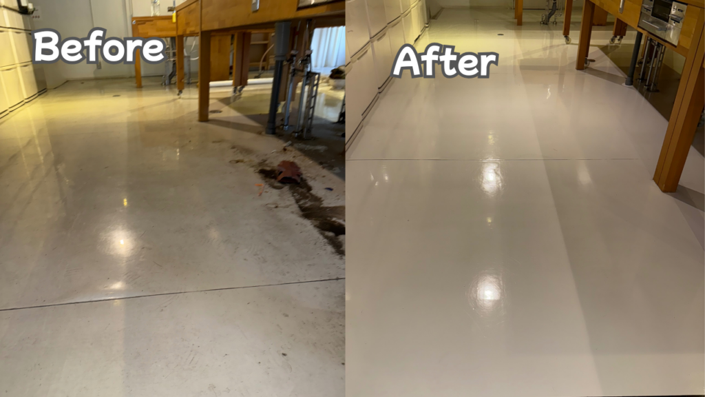 施設特有の安全性を最優先に、滑りやすさ・乾燥時間・導線を管理しながら施工。均一な艶と耐久性の両立を目指しました。